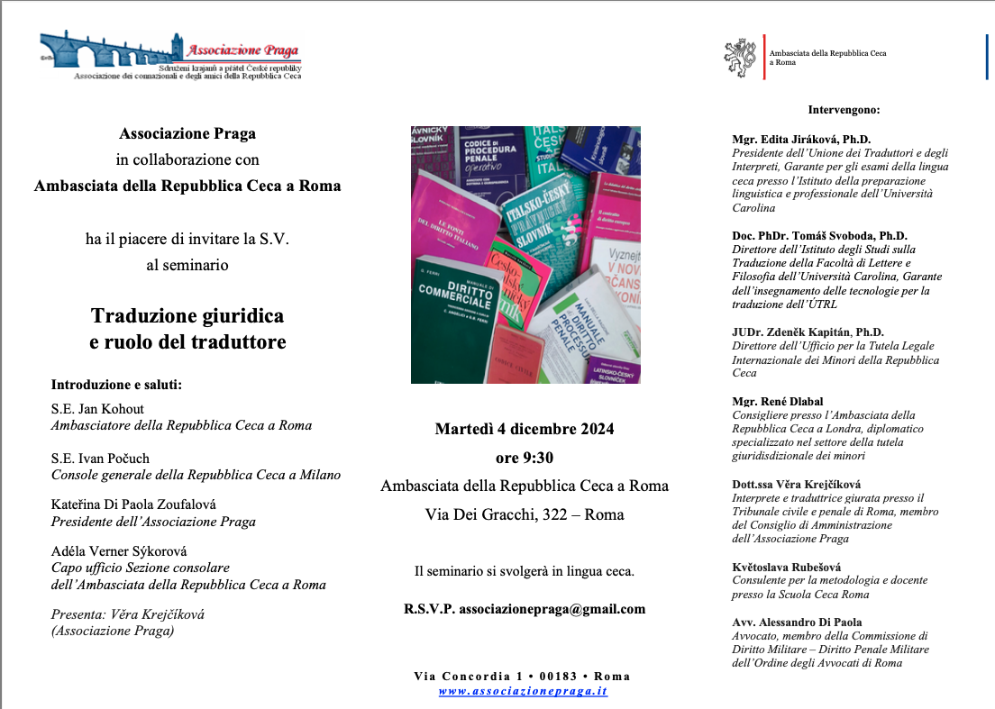 The Embassy of the Czech Republic in Rome, together with Associazione Praga, will be holding a seminar on Legal Translation and the Role of the Translator. The seminar will take place at the Embassy of the Czech Republic in Rome on the 4 December 2024 from approximately 9.30 a.m. to 5 p.m. and will be held in the Czech language.